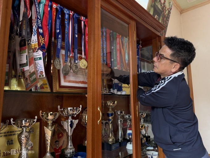 在仙芳村的一间平房里,54岁的屈文酉整理着客厅的玻璃柜,擦拭着奖牌、奖杯、奖状,这是他儿子屈文康13年足球生涯的财富。