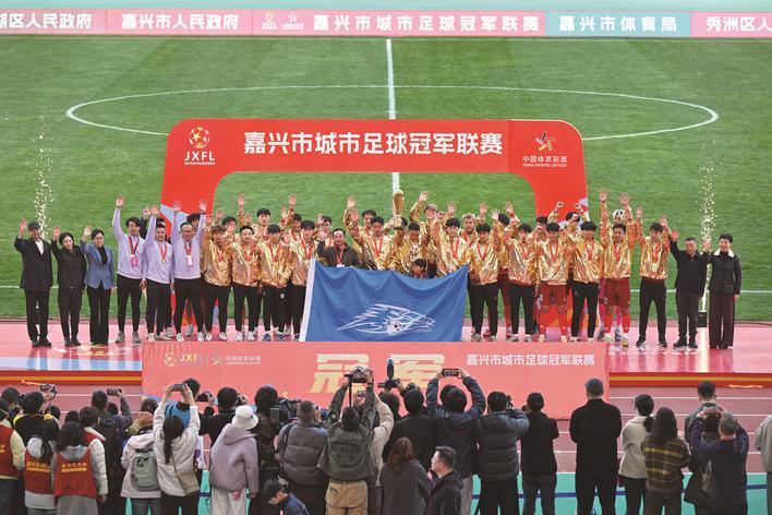 本报讯 3月14日下午,伴随着终场哨音的响起,场上比分最终定格在4:1,秀洲队战胜平湖队,捧起了2026嘉兴市城市足球冠军联赛(“嘉冠”联赛)的冠军奖杯。