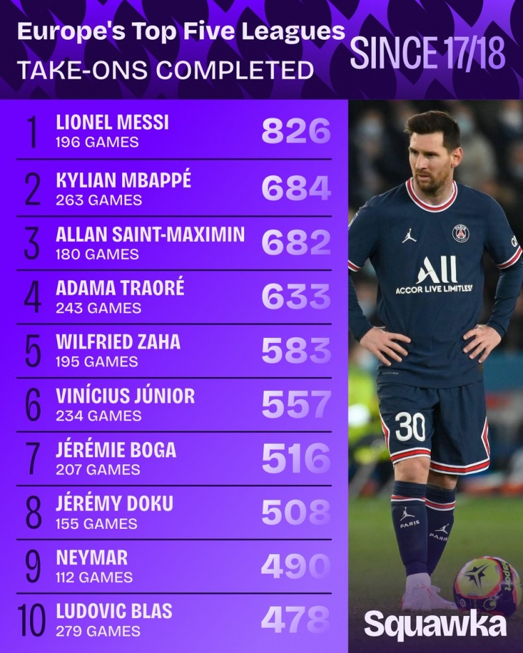 4月1日讯 Squawka列出了17-18赛季以来五大联赛成功过人排名,梅西826次居首,姆巴佩684次第二。
